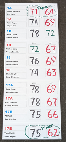 Low Gross team was Herb Taylor, Jody Ward, Bob White, and Chris Wright. Low Net team was Rickey Long, Rick Ashby, Ron Kordys, and Shelby Walters.